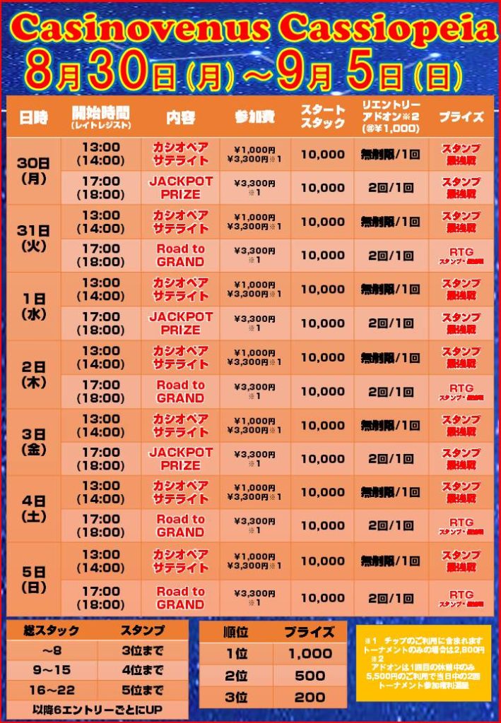 2021-08-29 【バカラDAY】8 月30日月曜日【13:00~最強戦サテライト&カシオペアトーナメント】【17:00~最強戦サテライト&ジャックポットトーナメント】