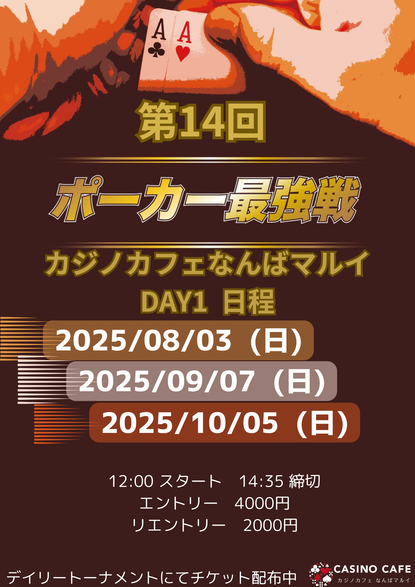 当店で行っているトーナメントで入賞した際にオレンジ色のチケットをお渡ししております。そのチケット保持者だけが出場出来る最強戦Day1のB日程が行われます。複数枚お持ちの方はスタートスタックを増やすかリエントリーに置いておくかお選び頂けます。