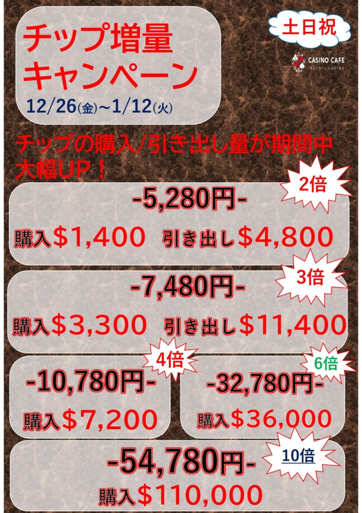 さて今回、1月のイベントとして【チンチロ】【チップ増量CP】【MAXUP】を実施いたします。
